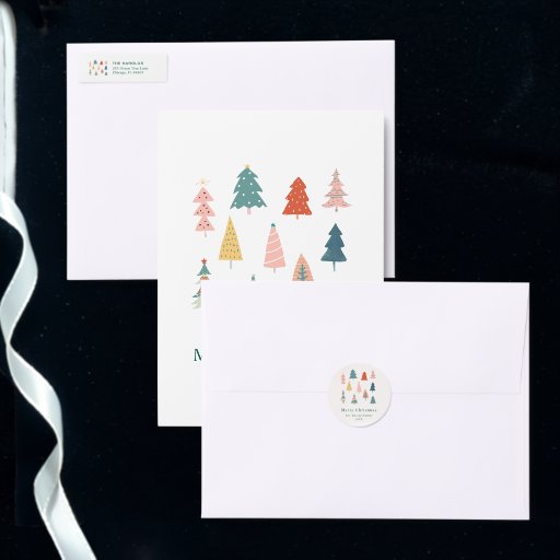 Green modern non-photo holiday sticker .This chic and stylish holiday sticker features a modern set of Christmas trees. The elegant text can be completely personalised with your choice of greeting, family name, and year.