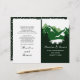 Green mountains and conifes folded wedding program. A trendy yet elegant wedding design featuring a mountain range through conifers and your names in handwritten style. The inside includes dark green and white borders with polka dots and white frames with your text.