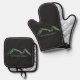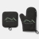 Black Oven Mitt & Pot Holder Set with mountains landscape and a customisable text in green colour. Perfect for Mother's of Father's Day, to make a gift to your mum, a cooking or pastry chef or for newlyweds!