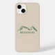 A light brown phone case with green mountains and personalised text. A nice gift idea for lovers of hiking & outdoor adventures!