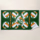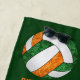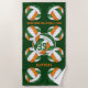 This volleyball team spirit beach towel features a pattern of green, orange and white stylised volleyballs arranged in a mirrored pattern with customisable text between the volleyballs, currently team name & mascot name - the athlete's name and jersey number can be personalised, as well as the darker green background colour - by katz_d_zynes
