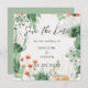 A modern and beautiful floral save-the-date card with a lovely wildflower watercolor design and a white, green, and orange colour scheme, accented by a contemporary calligraphy font for a fashionable yet romantic look.