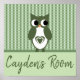 Green owl with a heart on its' belly in front of an argyle pattern background personalised nursery room or child's bedroom wall art poster. Personalise it with your child's name and make it your own.