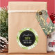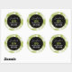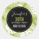 Birthday thank you stickers - with a repeating pattern of large palm leaves on an olive green background. Trendy modern and tropical. A black circle with a gold inner border layered over top with your personalised details inside.