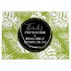 Wedding thank you gift bag (large sized) with a repeating pattern of large palm leaves on an olive green background. Trendy modern and tropical. A black circle with a gold inner border layered over top with your personalised details inside.