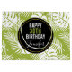 Personalised birthday gift bags (large size) with a repeating pattern of large palm leaves on an olive green background. Trendy modern and tropical. A black circle with a gold inner border layered over top with your personalised details inside.