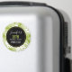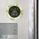 Birthday magnet with a repeating pattern of large palm leaves on an olive green background. Trendy modern and tropical. A black circle with a gold inner border layered over top with your personalised details inside.