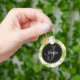 A keychain with a repeating pattern of large palm leaves on an olive green background. Trendy modern and tropical. A black circle with a gold inner border layered over top with your personalised details inside.