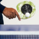 A black circle with a gold inner border layered over top with your personalised details inside.