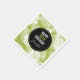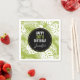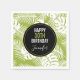 Party napkins with a repeating pattern of large palm leaves on an olive green background. A black circle with a gold border layered over top with your personalised birthday details inside.
