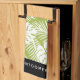 A kitchen towel personalised with a name. Designed with a repeating pattern of large palm leaves on an olive green background. Trendy modern and tropical.