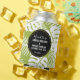 Wedding can coolers with a repeating pattern of large palm leaves on an olive green background. Trendy modern and tropical. A black circle with a gold inner border layered over top with your personalised details inside.