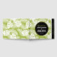 A wedding guestbook with a repeating pattern of large palm leaves on an olive green background. Trendy modern and tropical. A black circle with a gold inner border layered over top with your personalised details inside.