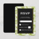A wedding RSVP card with a repeating pattern of large palm leaves on an olive green background. A black rectangle with a gold border layered over top with your info inside.