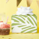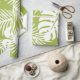 Wrapping paper with a repeating pattern of large palm leaves on an olive green background. Trendy modern and tropical.
