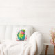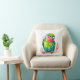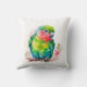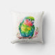A pillow with a cute parrot illustration. A little green parrot with blue and yellow colours blending together. Neck has a vibrant shade of reddish pink.