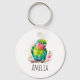 Personalised keychain with a cute parrot illustration. A little green parrot with blue and yellow colours blending together. Neck has a vibrant shade of reddish pink.