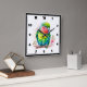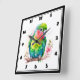 A clock with a cute parrot illustration. A little green parrot with blue and yellow colours blending together. Neck has a vibrant shade of reddish pink.