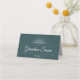 This elegantly designed place card features a rich green background, accented with a delicate, ornate crown motif at the top, symbolising dignity and tradition. The words "Grandma Susan" are gracefully scripted in a sophisticated, flowing font, followed by a crisp "Table One" designation, all enveloped by subtle decorative swirls. The design captures the essence of heritage and respect, perfect for assigning seating at formal gatherings, especially those centred around cherished family traditions.
