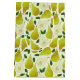 A pattern of vibrant green pears in shades of yellow and green with bright green leaves. Some of the pears are halved to show the juicy insides and seeds.