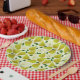 A pattern of vibrant green pears in shades of yellow and green with bright green leaves. Some of the pears are halved to show the juicy insides and seeds.