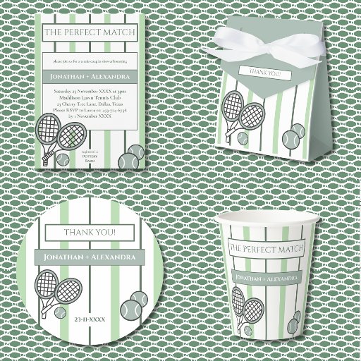 Serve up style and celebration with The Perfect Match Couples Bridal Shower paper cup, designed for couples who share a love of tennis and modern elegance. This charming, personalized design features tennis rackets paired with tennis balls in tones of green and white, all set against a chic mint, sage green and white stripes background. Elegant and modern yet playful, this paper cup is perfect for a fun tennis match–themed celebration and brings a fresh, stylish touch to your drink station. With modern typography font details and a clean, contemporary look, it’s ideal for couples celebrating for a match made in heaven. Perfect for cold beverages, this paper cup is a delightful addition to a couples bridal shower, blending sporty charm with timeless sophistication.