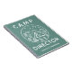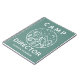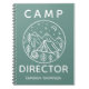 Green and white summer camp director notebook personalised with a name. Modern design with mountains, a campfire, a forest, the moon and stars, and a camping tent.