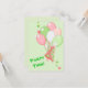 Here's a colourful and fun kids birthday party invitation which features pink and green balloons, stars, and a polka dot party hat. The back of the invitation holds your party information and a smaller image a party cup and cupcake. The images and text are placed on a light green background. All the text is easily customised by you. If you need to move the text around, choose "Customise it", and use the arrows to move text. Cute for anyone's birthday party, including children of any age.
