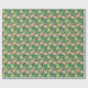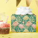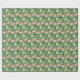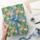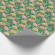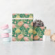 Wrapping paper with a pattern of pink, peach and yellow peonies on a dark green background.
