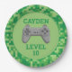 Green pixelated level Up video game birthday part party plates.
