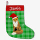 Bright green plaid and fox wearing Santa hat on personalised Christmas stocking.