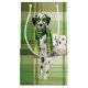 A fashionable Dalmatian dog is dressed in a green scarf and cool sunglasses makes a cute impression and a fashion statement which is paired with a green plaid pattern in shades of green suitable for any gender or age.