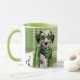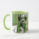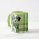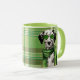 A very stylish Dalmatian dog in green sunglasses and a green scarf against a plaid patterned background in shades of green. Great for the holidays, but okay any time of the year.