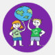 Earth day stickers. Green Message stickers and Recycle message stickers with illustration of a boy and girl holding the planet earth wearing shirts that have the recycle symbol.