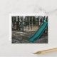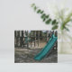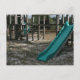 A photograph of a green slide at a playground, with the wooden jungle gym swingset next to it. Plenty of room for custom text or leave as is!