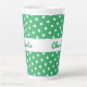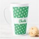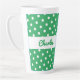 A green and white latte mug with retro polka dot pattern. Personalise the mug with the recipient's name for a stylish individual gift.