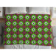 "Two towels and a washcloth with a geometric floral pattern in green, purple, and white. The design features repeating hexagons and flowers."