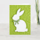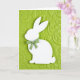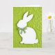 This design shows a white rabbit silhouette in side view, with tall ears held upright as if listening closely, set against a bright lime-green background 🌷. Across the green surface, a raised pattern of curling swirls, leaf shapes, and abstract forms adds gentle depth without stealing attention from the rabbit. Around the rabbit’s neck sits a neatly tied bow with slim vertical stripes in deeper green and white, like a small gift shared between close friends 🐰. The smooth white shape and the textured background create a quiet contrast that feels tender, like someone dressing up for a springtime visit. Light falls evenly across the scene, sharpening the rabbit’s edges while softly catching the ridges of the embossed pattern. There is no visible border, and the layout keeps the rabbit centered so the eye stays on its calm posture and the bow’s careful knot. No text appears on the front, leaving open space around the rabbit against the lime-green field, with the striped bow resting just below its chin.
