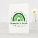 This greeting card features a white background with a green rainbow arcing across the center, made of three concentric bands that shift from deep emerald on the outside to bright lime toward the middle. Each band has gentle, swirling textures that give it a soft, inviting look, like something you’d linger over with a close friend. Above the arc, a scatter of small green dots forms a light halo, like confetti or dew catching the light, adding a flirty sparkle 💚. Centered under the rainbow sits a classic three-leaf shamrock in rich green, grounding the scene with a steady, lucky charm ☘️. Beneath the shamrock, the phrase “Shamrocks & Smiles” appears centered in rounded green lettering, easy to read and friendly in tone. The spacing keeps the artwork and text comfortably balanced, leaving plenty of white space that makes the greens stand out. The rainbow’s upper curve is ringed with dots in several shades of green, from darker forest tones to pale mint specks.