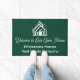 This professional realtor doormat is custom made with your real estate company name under the modern welcome in white cursive script for an open house. This chic custom green realty business decor features a house logo image for home builder or realty agent company marketing.
