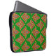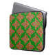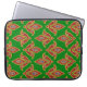 A stylish 15" laptop sleeve, with a 'fleur-de-lys' pattern in deep red and gold on a dark green background, with a black trim..