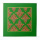 A stylish square ceramic tile with a 'fleur-de-lys' pattern in deep red and gold on a dark green background, from a digitally painted design by Judy Adamson.