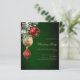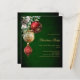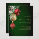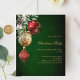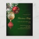 For a Christmas party with family and friends. A green uneven coloured background. Decorated with red and gold baubles and some greenery and a pine cone. Personalise and add the details.