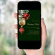 For a Christmas party with family and friends. A classic green background. Decorated with red and gold baubles and some greenery and a pine cone. Personalise and add the details.