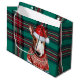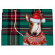 This festive Christmas gift bag features a charming Bull Terrier dog dressed for the holidays. The dog is sporting a red Santa hat and a cosy red and white sweater with snowflakes. The background is a cheerful green and red plaid pattern, adding to the holiday spirit. The bag has white handles, making it easy to carry and perfect for gifting. This unique and adorable design is sure to bring smiles to everyone who sees it.