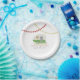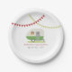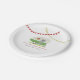 Plates featuring a blue illustration of a green vintage camper and bunting. Look for matching wedding invitations and more at Jill's Paperie.
