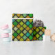 This illustration is based on geometric abstraction art, this design incorporates a variety of light green, mustard green and dark green squares.