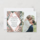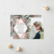 Pink, green, white, and faux printed rose gold summer, tropical, and elegant palm tree leaves on a plantation green background with geometric faux printed rose gold diamond cutouts, engagement announcement cards. This classic and sophisticated design is perfect for the classy, trendy, and stylish marrying couple. Personalise with your own message on the front and a customised monogram initial on the back. All photo print design.