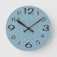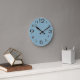 This wall clock has an art deco design of green half circles connect with lines on a field of blue.