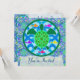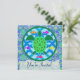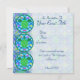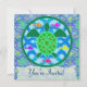 Custom two-sided invitation cards. Front has customisable "You're Invited". Back has invitation information--enter your event title, date, time, location, and a personal message. A green sea turtle with patterned shell, against a blue water/wave pattern, with several colourful fish. Circular design with a green border.